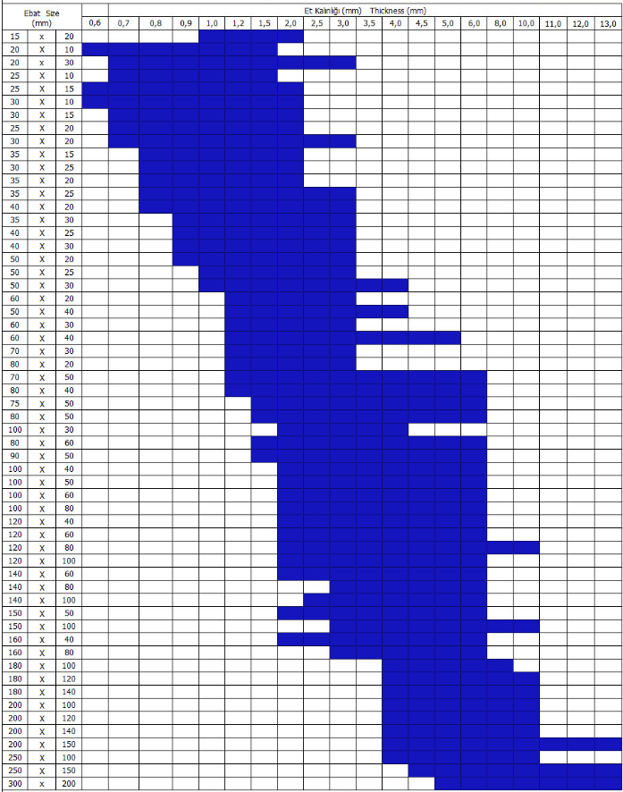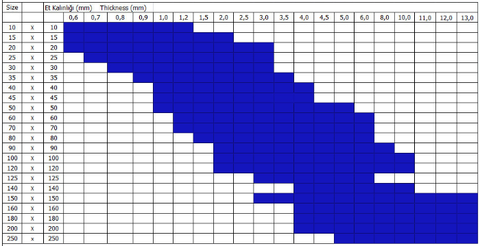 Ebatları 25X25/20X30 – 150X150/100X200 et kalınlığı 1,50- 8,00mm